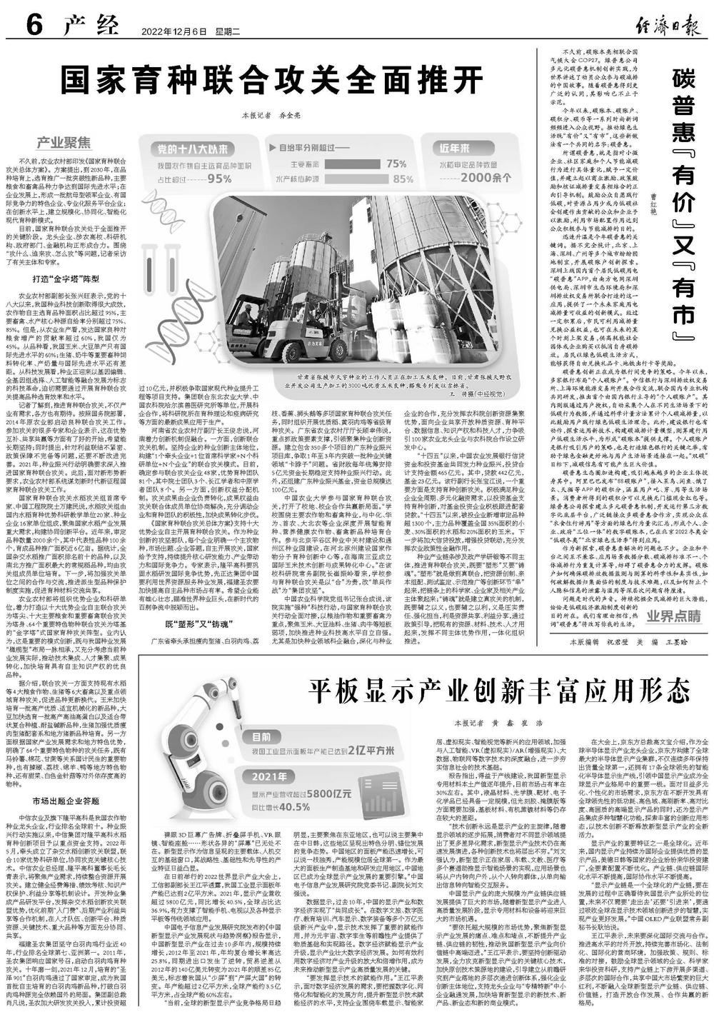 《国家育种联合攻关总体方案》支持十大优势企业自主开展育种联合攻关。作为种业创新的攻坚部队,每个企业明确一个主攻物种,市场出题、企业答题,自主开展攻关,国家给予支持,持续提升核心研发能力、产业带动力和国际竞争力。专家表示,隆平高科要巩固水稻研发国际竞争优势,先正达集团中国要利用世界资源服务种业发展,福建圣农要加快提高自主品种市场占有率。希望企业能有雄心壮志,瞄准世界种业巨头,在新时代的百舸争流中脱颖而出。