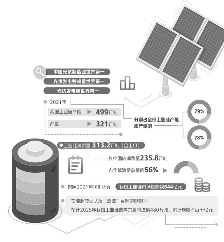 业内人士认为,工业硅下游产业为多晶硅、有机硅和铝合金等,均为朝阳产业,潜力巨大。一方面,多晶硅是光伏组件的主要原料,随着我国“双碳”目标的提出与逐步推进,光伏行业迎来快速发展期,预计至2025年多晶硅领域消费工业硅的数量将超过190万吨,占国内工业硅消费量的41%,成为工业硅最大消费领域。另一方面,有机硅是工业硅目前最大的消费用途,未来仍将保持年均10%以上的增长。