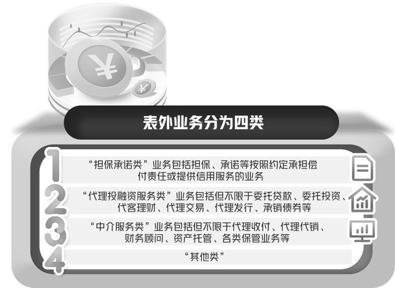 “此次公布的《办法》不留监管死角、贯彻‘穿透式’监管精神,具有四个特点。”董希淼说,一是分类更加完整,扩大了表外业务的定义范围,新兴表外业务被囊括其中。具体来看,《办法》将表外业务分为四类,即担保承诺类、代理投融资服务类、中介服务类、其他类。其中,“担保承诺类”业务包括担保、承诺等按照约定承担偿付责任或提供信用服务的业务;“代理投融资服务类”业务包括但不限于委托贷款、委托投资、代客理财、代理交易、代理发行、承销债券等;“中介服务类”业务包括但不限于代理收付、代理代销、财务顾问、资产托管、各类保管业务等。