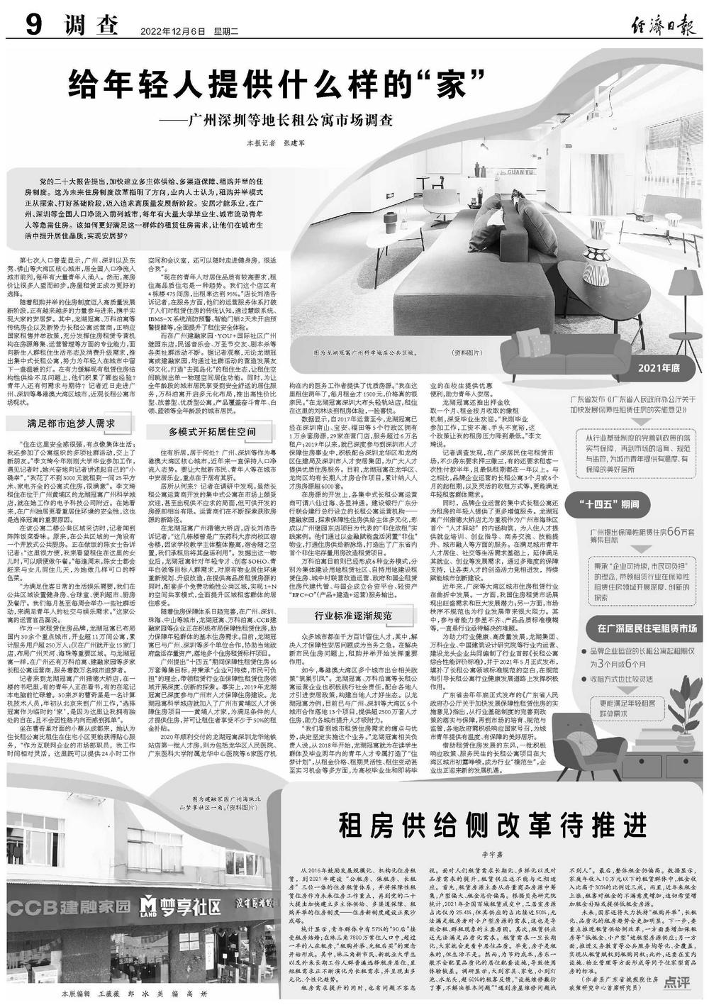 党的二十大报告提出,加快建立多主体供给、多渠道保障、租购并举的住房制度。这为未来住房制度改革指明了方向,业内人士认为,租购并举模式正从探索、打好基础阶段,迈入追求高质量发展新阶段。安居才能乐业,在广州、深圳等全国人口净流入前列城市,每年有大量大学毕业生、城市流动青年人等急需住房。该如何更好满足这一群体的租赁住房需求,让他们在城市生活中提升居住品质,实现安居梦?