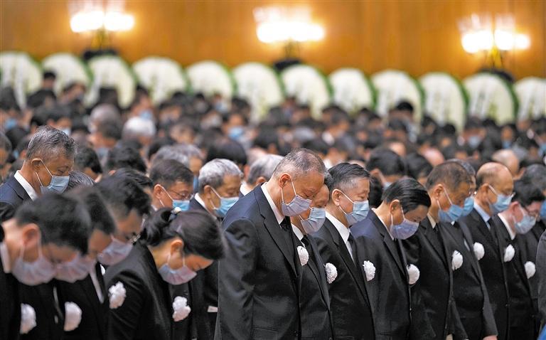 江泽民同志的骨灰盒安放在遗像前的鲜花翠柏丛中,骨灰盒上覆盖着鲜红的中国共产党党旗。江泽民同志的夫人王冶坪率全家敬献的花篮摆放在江泽民同志的骨灰盒前。6名礼兵持枪肃立,守护在两旁。新华社记者 殷博古摄