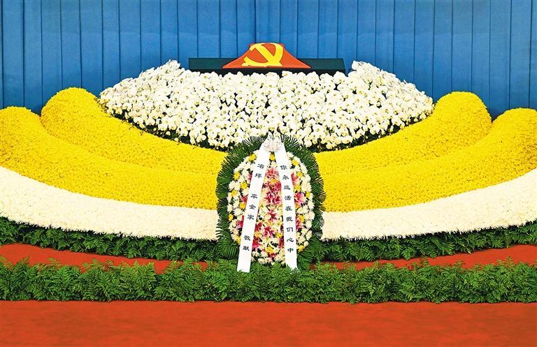 江泽民同志的骨灰盒安放在遗像前的鲜花翠柏丛中,骨灰盒上覆盖着鲜红的中国共产党党旗。江泽民同志的夫人王冶坪率全家敬献的花篮摆放在江泽民同志的骨灰盒前。