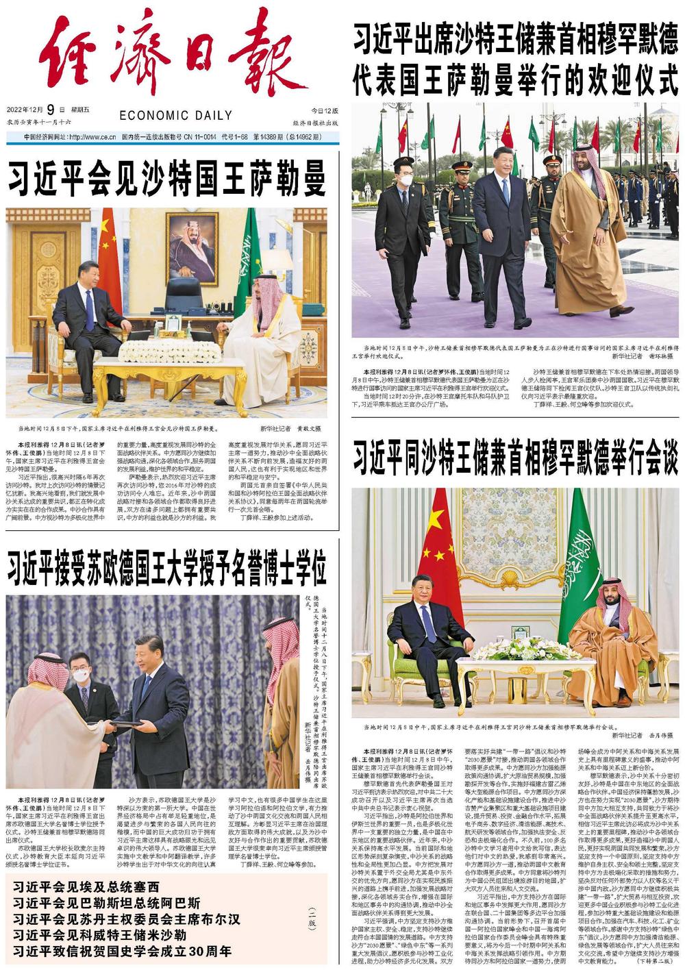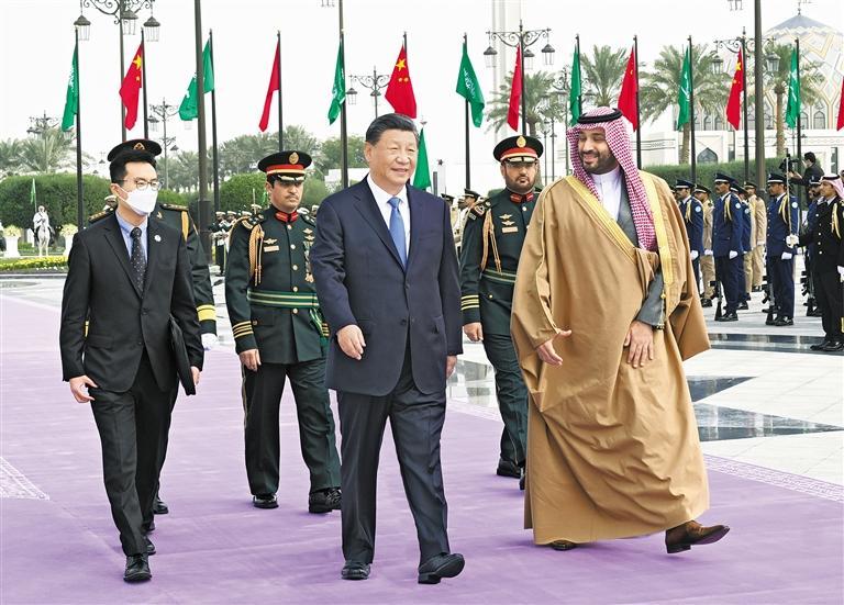沙特王储兼首相穆罕默德在下车处热情迎接。两国领导人步入检阅亭,王宫军乐团奏中沙两国国歌。习近平在穆罕默德王储陪同下检阅王宫仪仗队。沙特王宫卫队以传统执剑礼仪向习近平表示最隆重欢迎。