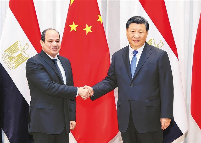 习近平指出,当前,国际和地区形势深刻复杂演变,中埃关系的战略性、全局性更加凸显。中国和埃及理念相通,利益相连,双方应该携手努力,朝着新时代构建中埃命运共同体目标,推动两国全面战略伙伴关系得到新的更大发展。