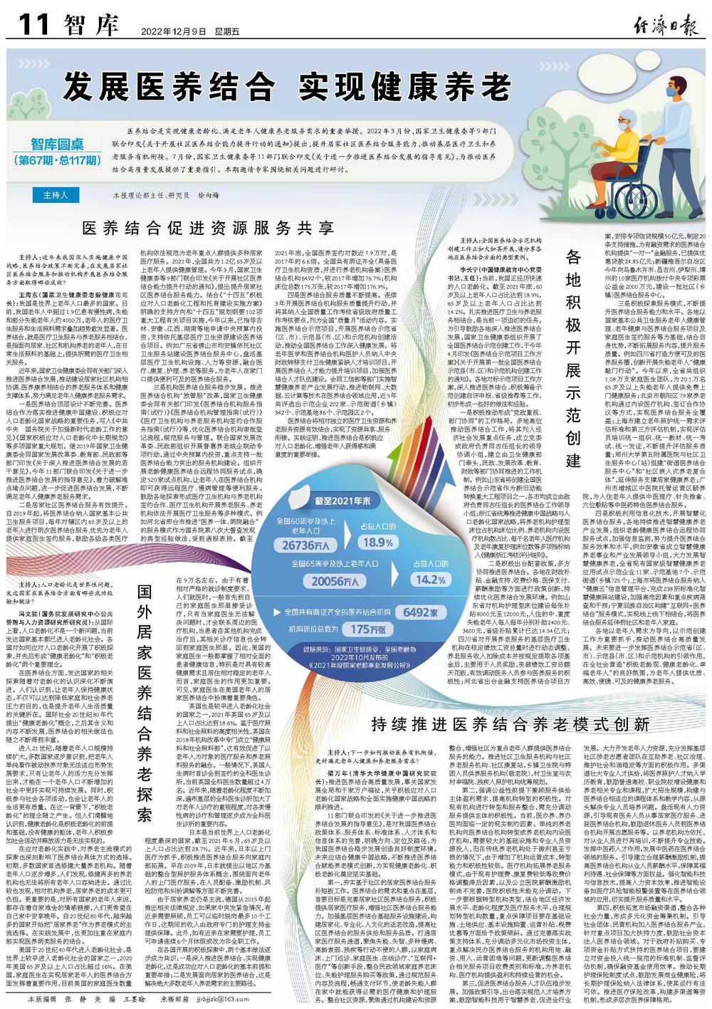 11部门联合印发的《关于进一步推进医养结合发展的指导意见》,是对我国医养结合政策体系、服务体系、标准体系、人才体系和信息体系的完善,明确方向、定位及路径,为我国医养结合稳步发展创造良好制度环境。未来应结合健康中国战略,不断推进医养结合赋能养老模式创新,为实现健康老龄化、积极老龄化奠定坚实基础。