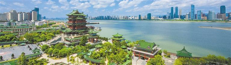 ◀俯瞰江西省南昌市一江两岸景色。南昌优化城市发展布局,加快“一枢纽四中心”建设。