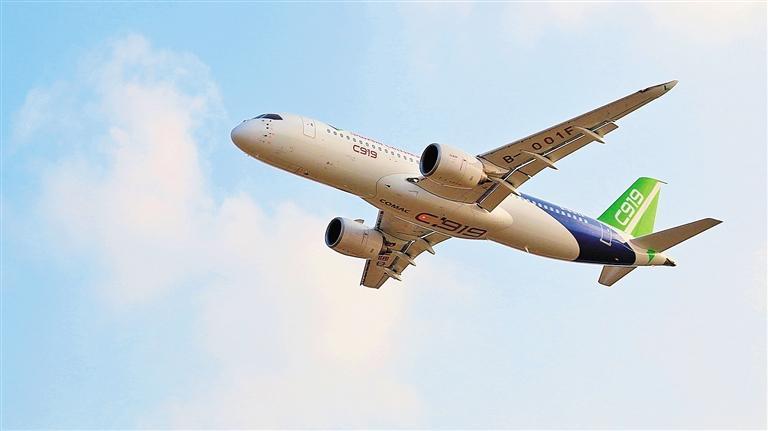 ◀一架翱翔在蓝天上的国产大飞机C919。南昌形成了以航空工业洪都、商飞(江西)飞机制造有限公司两大整机制造龙头企业为骨干,深度融合国产飞机分工体系的航空产业布局。