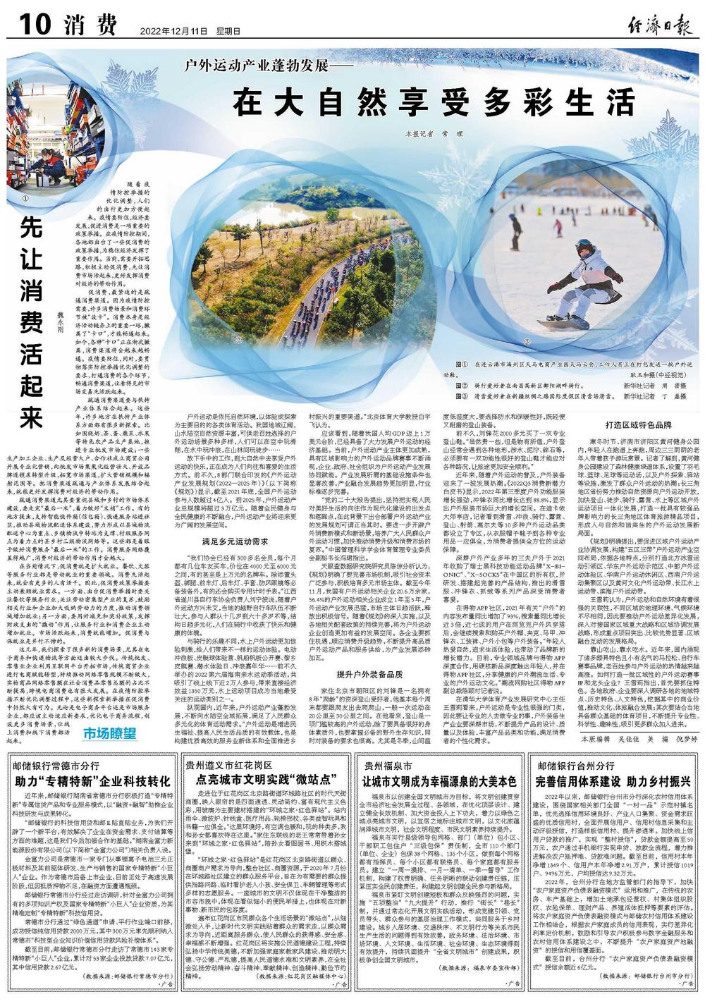 “党的二十大报告提出,坚持把实现人民对美好生活的向往作为现代化建设的出发点和落脚点,在此背景下出台部署户外运动产业的发展规划可谓正当其时。要进一步开辟户外消费新模式和新场景,培养广大人民群众户外运动习惯,加快推动消费升级和消费市场的复苏。”中国管理科学学会体育管理专业委员会副秘书长冯珺指出。