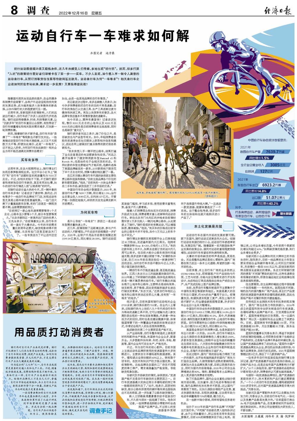 骑行运动既低碳环保又锻炼身体,近几年来颇受人们青睐,多地出现“骑行热”。然而,很多打算“入坑”的新晋骑行爱好者们却被卡在了第一步——买车。不少人发现,如今想入手一辆令人满意的运动自行车,从预订到取货往往要等待数周甚至数月。运动自行车为何“一车难求”?相关自行车企业该如何抓住市场机遇,谋求进一步发展?又面临哪些挑战?