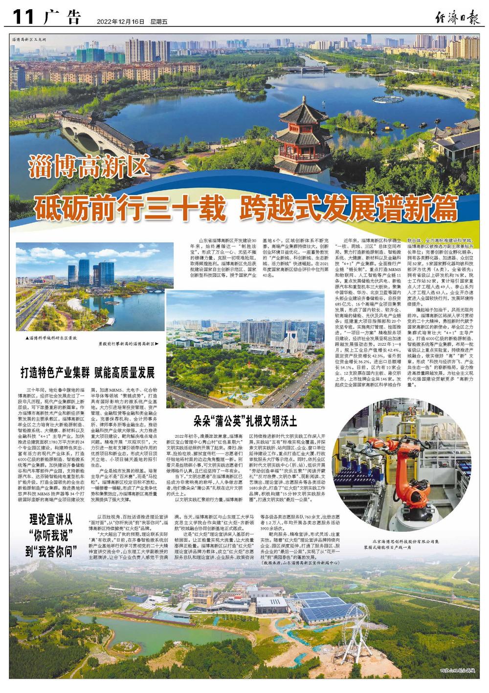 近年来,淄博高新区科学确立“一核、两城、三区”总体空间布局,聚力打造新能源制造、智能微系统、大健康、新材料以及金融科技“4+1”产业集群。全面推行产业链“链长制”,重点打造MEMS和物联网、人工智能等产业链11条,重点发展储能光伏风电、新能源汽车和重型机车三大板块,聚集中国华能、华为、北京卫蓝等国内头部企业建设齐鲁储能谷,总投资685亿元、16个高端产业项目集聚发展,形成了国内较长、较齐全、较高端的储能、光伏及风电产业链条;组建重大项目指挥部和20个攻坚专班,实施亮灯管理、挂图推进,“一项目一方案”精准服务项目建设,经济社会发展呈现出加速跨越发展强劲态势。2022年1—8月,规上工业总产值增长42.4%,固定资产投资增长42.3%,省外到位资金增长36.2%,进出口总额增长54.1%。目前,区内有10家企业、12支股票在国内主板、港交所上市,上市挂牌企业共146家。发起成立全国国家高新区科学城合作联合体,全力高标准建设科学城,淄博高新区被推选为副主席兼秘书长单位;完善创新创业孵化链条,拥有各类孵化器、加速器、众创空间32家,5家国家孵化器均被科技部评为优秀(A类),全省领先;拥有省级以上研发机构76家,院士工作站32家,累计培引国家重点人才工程人选49人、泰山系列人才工程人选63人。企业开办速度进入全国较快行列,发展环境持续提升。