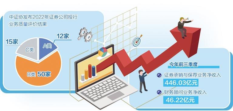 首次券商投行业务质量评价结果出炉。近日,中证协发布2022年证券公司投行业务质量评价结果的公告,其中,12家券商被评为A类,50家券商被评为B类,15家券商则被评为C类。
