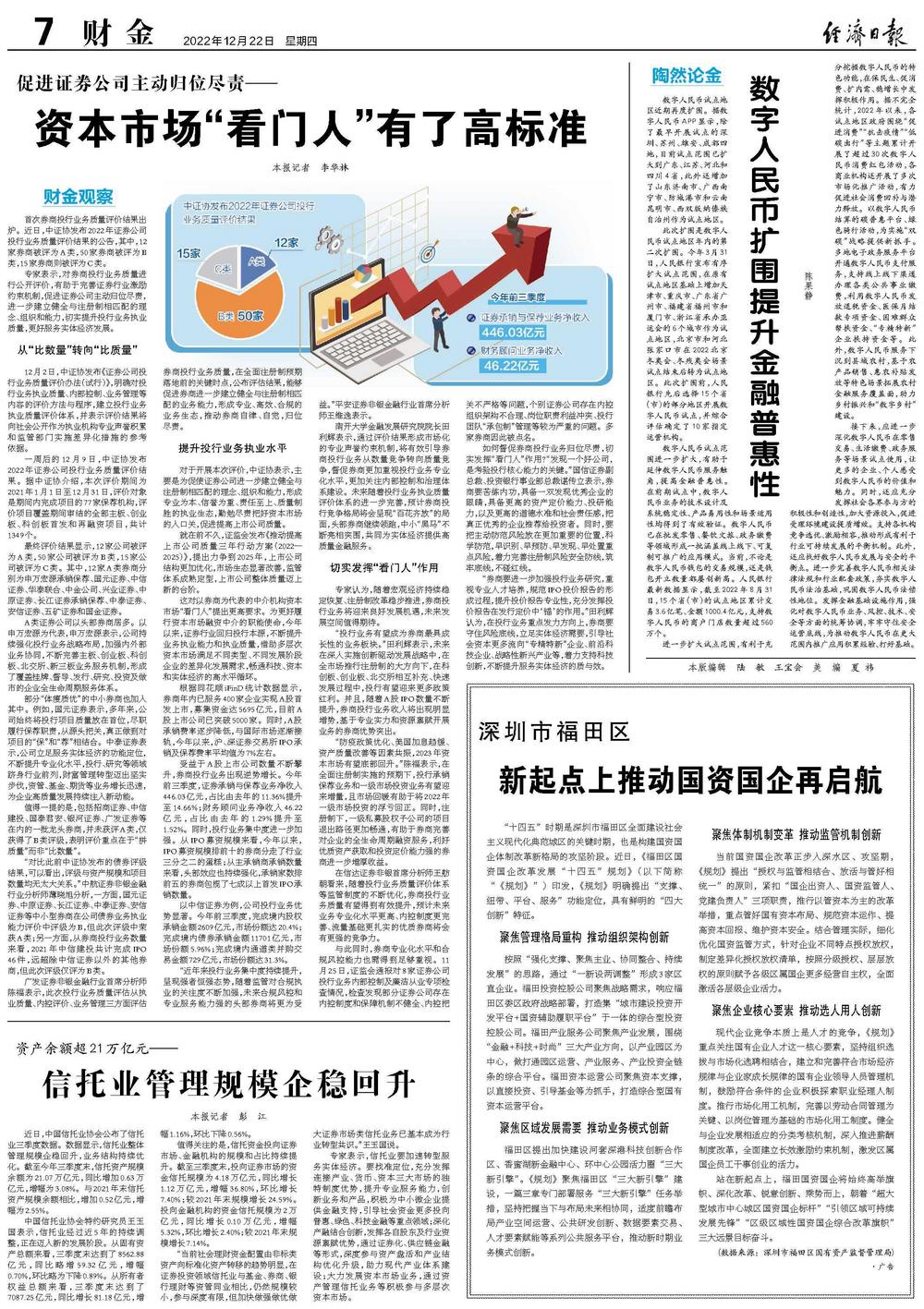 这对以券商为代表的中介机构资本市场“看门人”提出更高要求。为更好履行资本市场融资中介的职能使命,今年以来,证券行业回归投行本源,不断提升业务执业能力和执业质量,借助多层次资本市场满足不同类型、不同发展阶段企业的差异化发展需求,畅通科技、资本和实体经济的高水平循环。