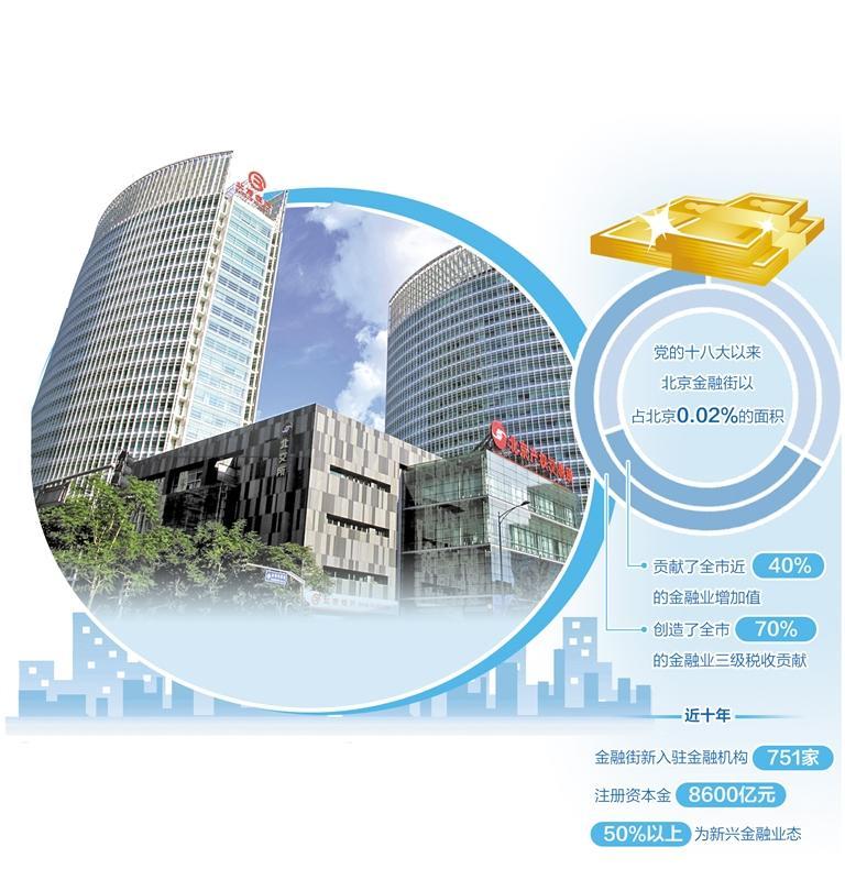 这十年,也是北京金融街大跨越、大发展的十年。党的十八大以来,北京金融街以北京0.02%的面积,贡献了全市近40%的金融业增加值,创造了全市70%的金融业三级税收贡献。金融业成为经济结构中占比最高、对经济增长拉动最大、财政增收贡献最明显的第一支柱产业。