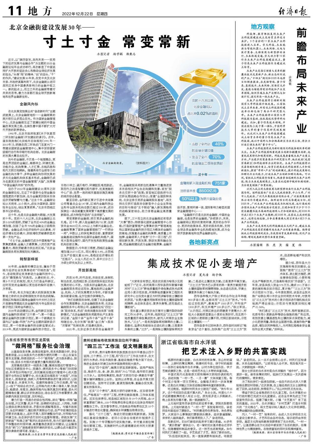 近日,以“踔厉奋发,共向未来——变局下的经济发展与金融合作”为主题的2022金融街论坛年会成功举行,再次彰显了中国坚持扩大开放的坚定决心和推动全球经济发展的担当。“永葆‘闯’的精神、‘创’的劲头、‘干’的作风。”建设发展30年来,在党中央及北京市委、市政府谋篇布局下,北京金融街从老旧居民区变身中国最具影响力的金融中枢之一。新的起点上,而立之年的金融街带着对未来的思考,着力为首都打造全球开放新高地和世界金融新坐标。