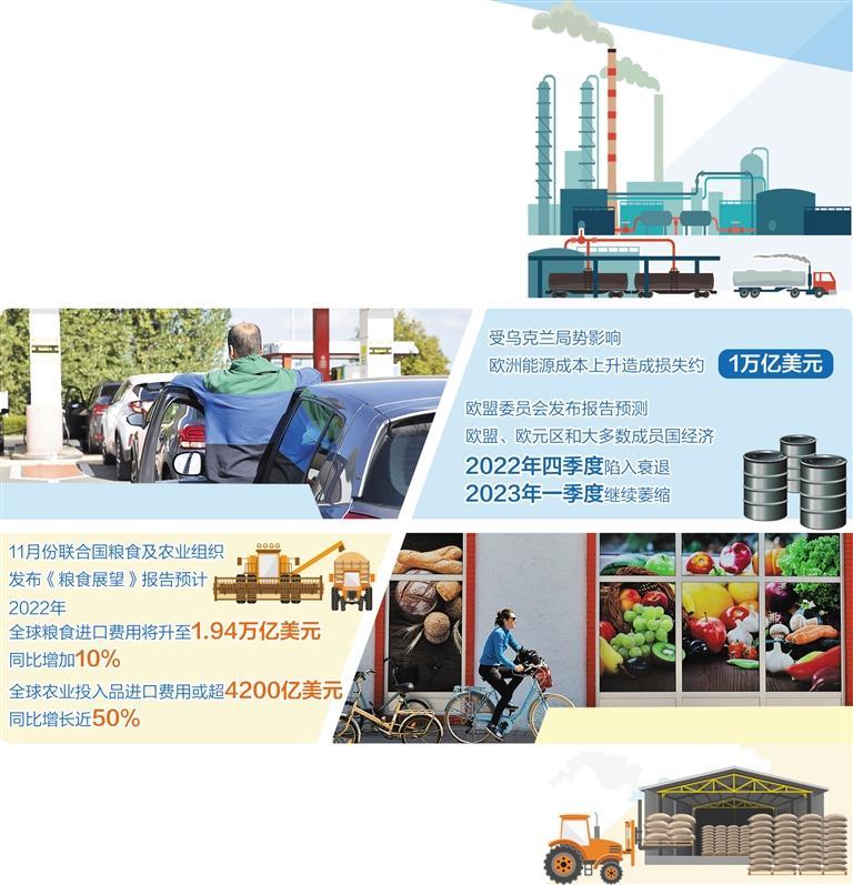 身处风暴中心的欧洲,毫无疑问是这场危机的最大埋单者。美媒报道指出,受乌克兰局势影响,欧洲能源成本上升造成的损失已达约1万亿美元。能源危机带来的种种负面影响:欧元贬值、通胀加剧、中产阶层陷入贫困、企业背负巨额亏损……让欧洲苦不堪言。欧盟委员会近日发布的2022年秋季经济预测报告称,欧盟、欧元区和大多数成员国经济预计在2022年四季度陷入衰退,2023年一季度经济活动将继续萎缩。