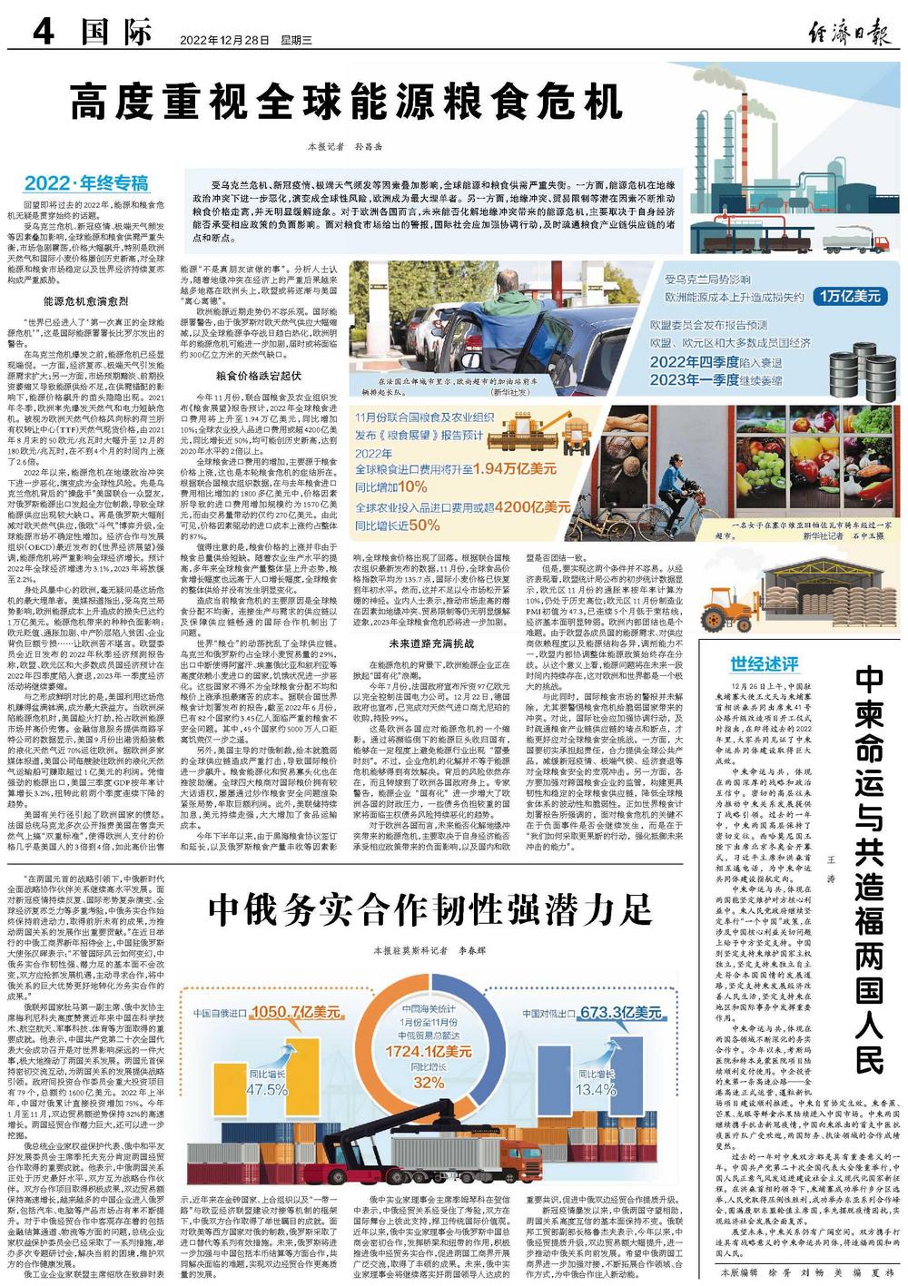 受乌克兰危机、新冠疫情、极端天气频发等因素叠加影响,全球能源和粮食供需严重失衡,市场急剧震荡,价格大幅飙升,特别是欧洲天然气和国际小麦价格屡创历史新高,对全球能源和粮食市场稳定以及世界经济持续复苏构成严重威胁。