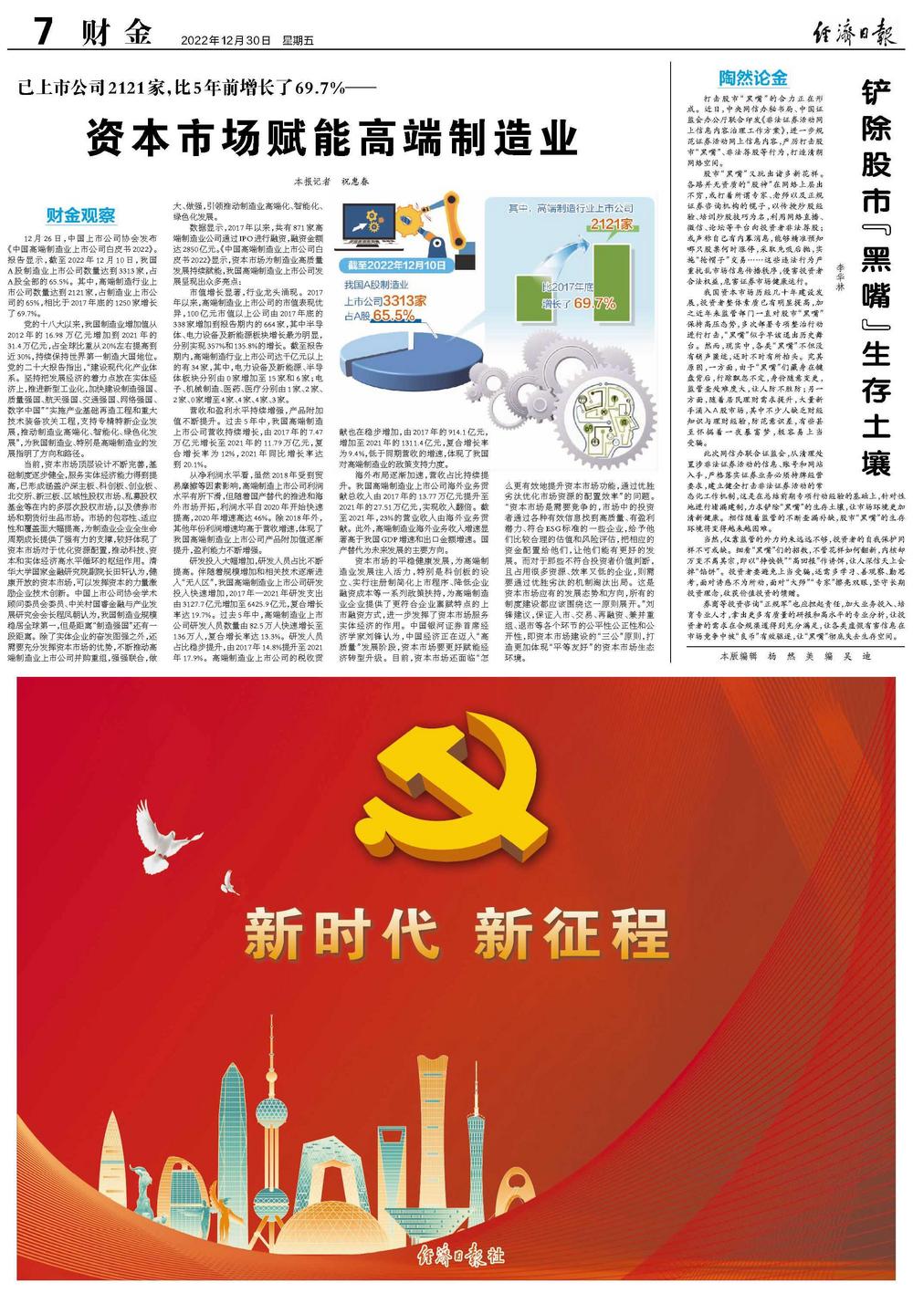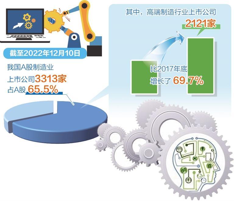 12月26日,中国上市公司协会发布《中国高端制造业上市公司白皮书2022》。报告显示,截至2022年12月10日,我国A股制造业上市公司数量达到3313家,占A股全部的65.5%。其中,高端制造行业上市公司数量达到2121家,占制造业上市公司的65%,相比于2017年底的1250家增长了69.7%。