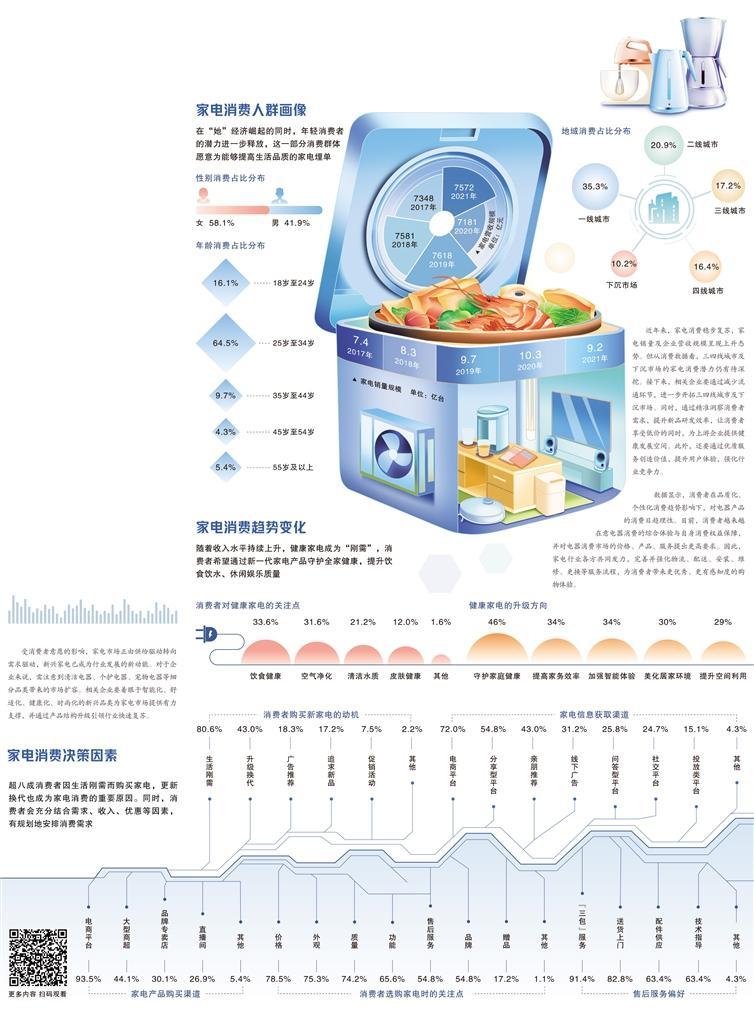 从家电供销渠道看,线上线下协同的全渠道模式探索将进一步影响家电市场。2022年,传统线下零售卖场向高端化、场景化转型;电商向线下发展,寻求突破流量瓶颈;私域流量会受到更多关注。