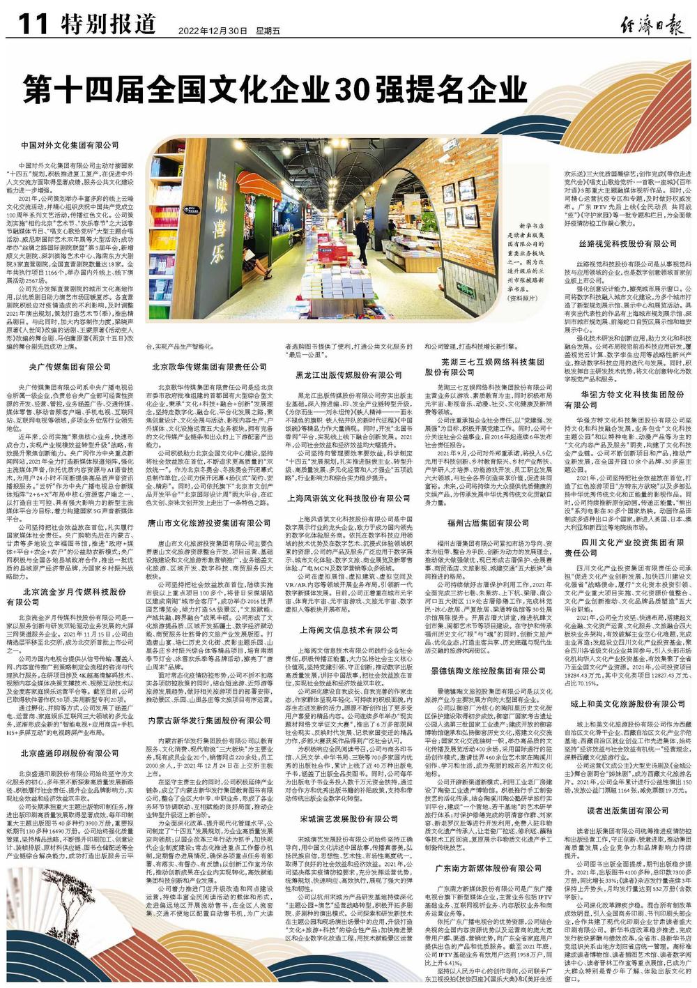 黑龙江出版传媒股份有限公司夯实出版主业基础,深入推进编、印、发全产业链转型升级,《为你而生——刘永坦传》《铁人精神——一面永不褪色的旗帜 铁人钻井队的新时代征程》《中国饭碗》等精品力作大量涌现。同时,开发“北国书香网”平台,实现线上线下融合创新发展。2021年,公司社会效益和经济效益均大幅提升。