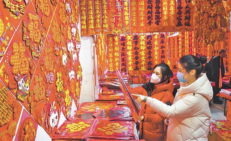 2022年12月31日,顾客在河北省白沟新城小商品市场选购春联、福字。元旦假期期间,当地商贸市场内,摆放整齐的春联、中国结、红灯笼等新春饰品随处可见,很多市民前来选购,浓烈的“中国红”营造出热烈喜庆的节日氛围。冯 云摄(中经视觉)
