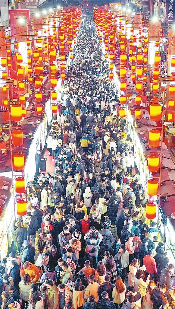 元旦假期,河南省洛阳市老城十字街,游客品味美食、购买商品,感受千年古都“夜魅力”。近日,多地持续优化疫情防控政策,餐饮行业积极复工复产,游客出行热情持续攀升,市场需求加快释放,消费出现明显复苏回暖态势。