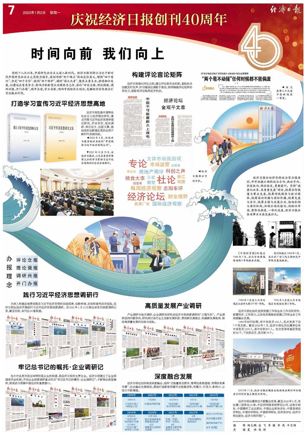 经济日报社始终坚持政治家办报原则,牢牢把握正确的政治方向、舆论导向、价值取向,踔厉奋发,勇毅前行。坚持“减量化改革、高质量发展”理念,统筹宣传报道与事业发展,统筹传统媒体与新兴媒体,统筹国内传播与国际传播,统筹发展与安全,统筹主报与社属企业、驻地机构与海外机构,加强全局性谋划、战略性布局、整体性推进、一体化发展,经济日报社各项事业日益发展壮大。
