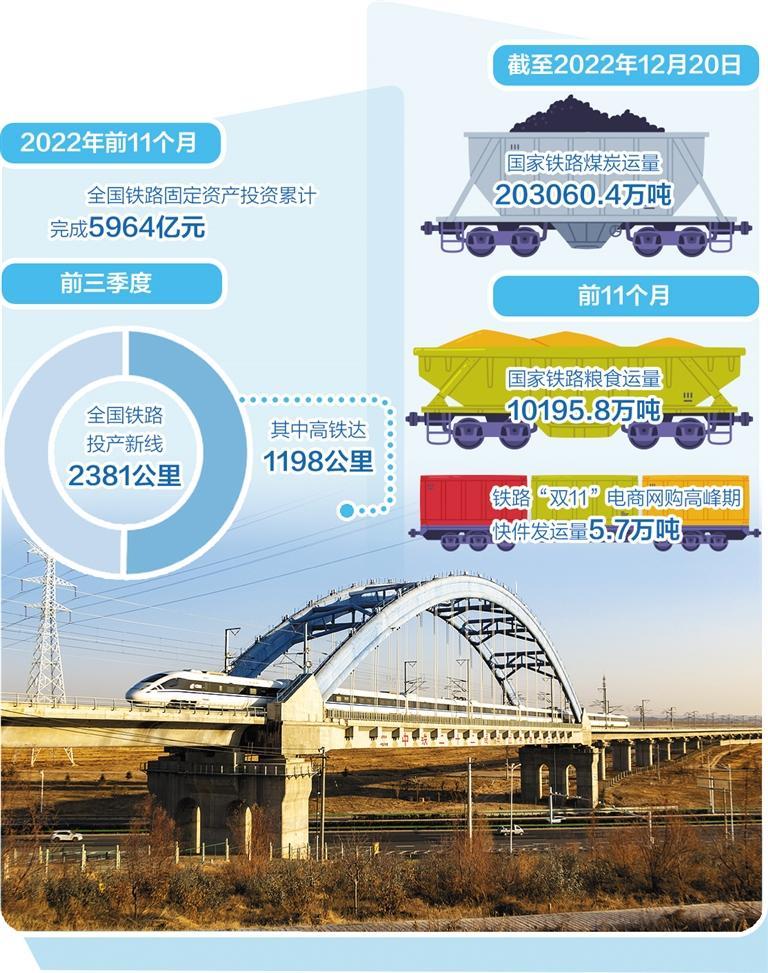 经过努力,2022年前11个月,全国铁路固定资产投资累计完成5964亿元。前三季度,全国铁路投产新线2381公里,其中高铁达1198公里。