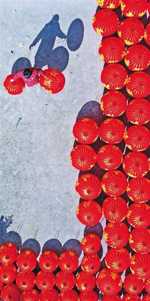 ③浙江省仙居县横溪镇一家灯笼加工作坊,村民在晾晒红灯笼,供应节日市场。