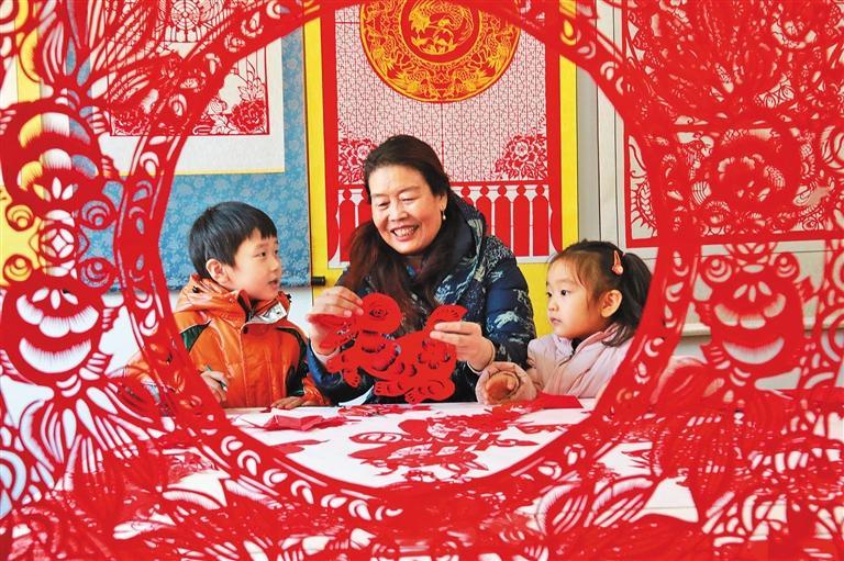 ④山东省高密市剪纸艺社,剪纸非遗传承人田桂芹(中)和孩子们共同创作兔元素生肖剪纸作品。李海涛摄(中经视觉)