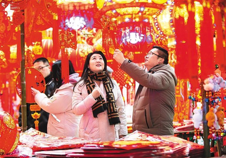②江西省弋阳县城北综合市场上年货交易红红火火,市民纷纷选购福字、灯笼、窗花等年货饰品,喜迎新年。黄祥龙摄(中经视觉)