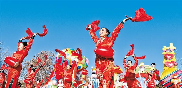 ⑥甘肃省张掖市甘州区2022冰雪季暨“迎新春·促消费”系列活动启动,当地文艺工作者在表演《欢乐腰鼓》。王 将摄(中经视觉)