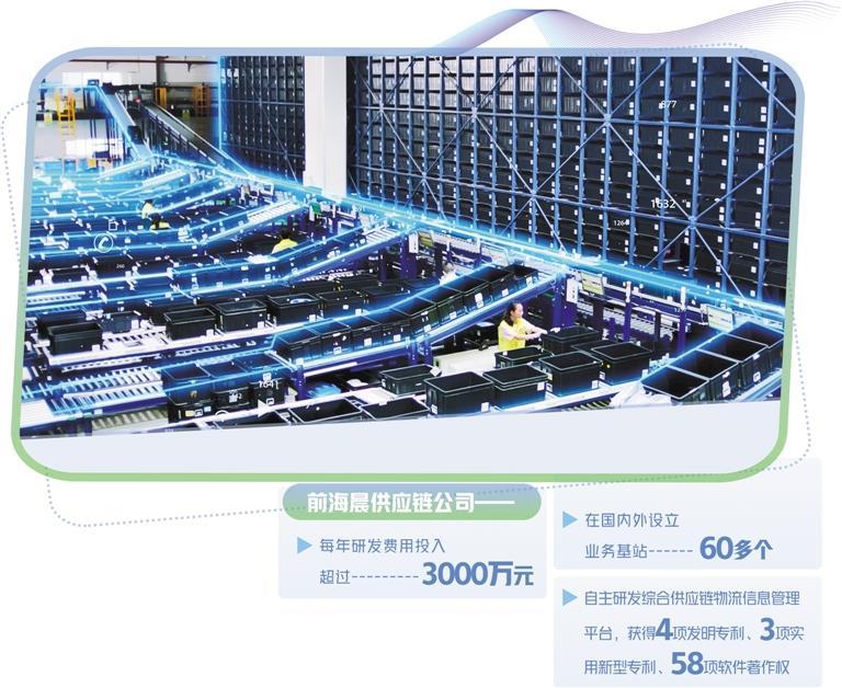 基于技术运用、资源整合、效率提升,前海晨供应链公司已建立了一支近百人的研发队伍,每年研发费用投入超过3000万元。目前,公司自主研发了集智能运输、仓储管理、关务服务、系统集成为一体的综合供应链物流信息管理平台,并获得4项发明专利、3项实用新型专利、58项软件著作权。