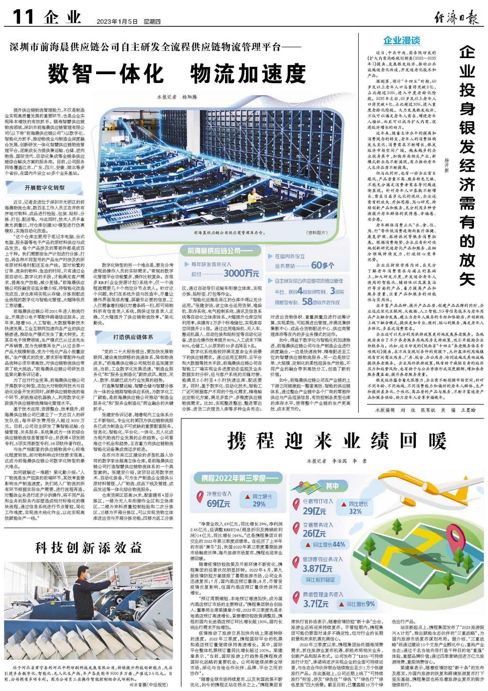 提升供应链物流管理能力,不仅是制造业实现高质量发展的重要环节,也是企业实现降本增效的有效抓手。瞄准智慧供应链物流领域,深圳市前海晨供应链管理有限公司(以下称“前海晨供应链公司”)以数字化、智能化为抓手,推动物流业与制造业深度融合发展,创新研发一体化智慧供应链物流管理平台,逐渐成长为提供集运输、仓储、逆向物流、国际货代、自动化集成等全链条供应链综合解决方案的服务商。目前,公司服务网络覆盖江苏、广东、四川、安徽、湖北等多个省份,在国内外设立60多个业务基站。