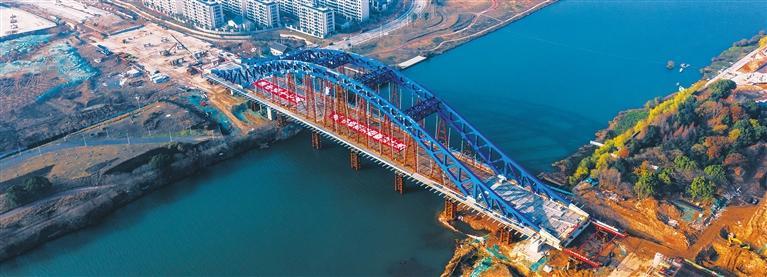 1月5日,位于浙江衢州的衢州双港大桥整体顶推到位、成功合龙。该桥为国内最大万吨级下承式钢桁架拱桥,由中铁十七局、铁五院承建,预计今年7月份完工。项目建成后对衢州打造浙闽赣皖四省边际交通物流中心城市等具有重要意义。吴 凡摄(中经视觉)