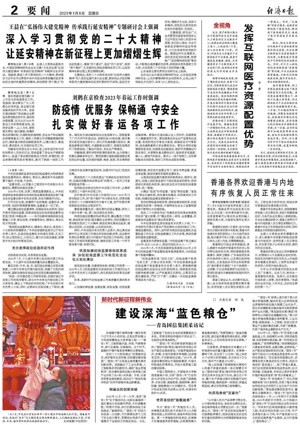 “‘国信1号’有效落实了‘向江河湖海要食物’的大食物观,实现了海水养殖由传统农业化向现代工业化生产方式的创新探索。”青岛国信集团党委书记、董事长王建辉表示,“国信1号”迭代升级的姊妹船2-1号、2-2号预计于近期建造,2024年底前交付使用,30万吨超大型“国信3号”已启动功能论证和总体设计,“未来我们还将陆续建造50艘养殖工船,形成总吨位突破1000万吨、年产各类海水鱼40万吨、年产值突破500亿元的深远海养殖产业链条,全力打造海上‘蓝色粮仓’。”