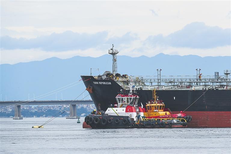 图为在巴西里约热内卢瓜纳巴拉湾拍摄的一艘集装箱货轮。