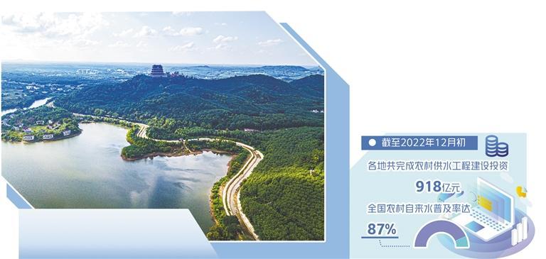 作为乡村的重要基础设施和公共服务,农村供水事关亿万农民群众的生活质量、生命健康。水利部农村水利水电司司长陈明忠介绍,2022年以来,水利部会同各地加快农村供水工程建设,持续提升农村供水保障水平。截至2022年12月初,各地共完成农村供水工程建设投资918亿元,完成工程建设1.6万处,提升了7449万农村人口供水保障水平,全国农村自来水普及率达到87%,比年度目标提高了2个百分点。