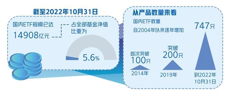 Wind数据显示,截至2022年10月31日,国内ETF规模已达14908亿元,占全部基金净值比重为5.6%,从产品数量来看,自2004年以来国内ETF数量逐年增加,在2014年首次突破100只,2019年突破200只,到2022年10月31日,国内ETF数量已达到747只。