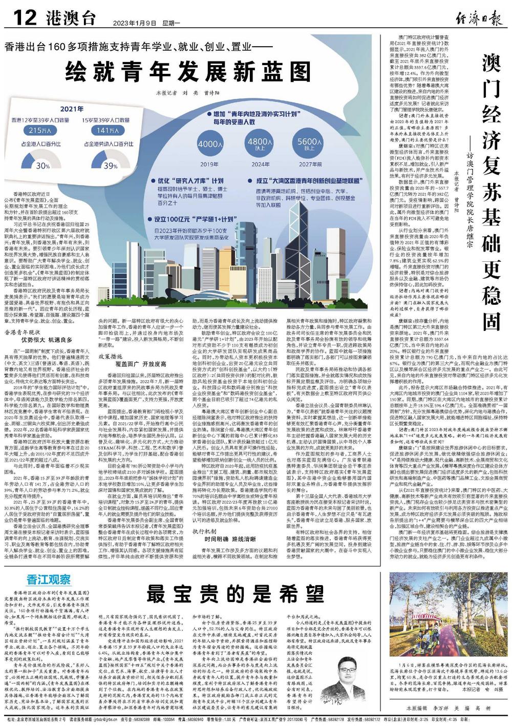 香港立法会议员、全国港澳研究会理事周文港在接受本报记者采访时表示,蓝图强调青年的向上流动,教育、生涯规划、交流实习、职业及高等教育等都包括在内,协助青年人解决学业、就业、创业、置业上的困难,全链条打通青年在不同年龄阶段所需要解决的问题。新一届特区政府有很大的决心加强青年工作,香港的青年人应该一步一个脚印拾级而上,并通过投身内地市场及“一带一路”建设,投入新发展格局,不断创新进取。