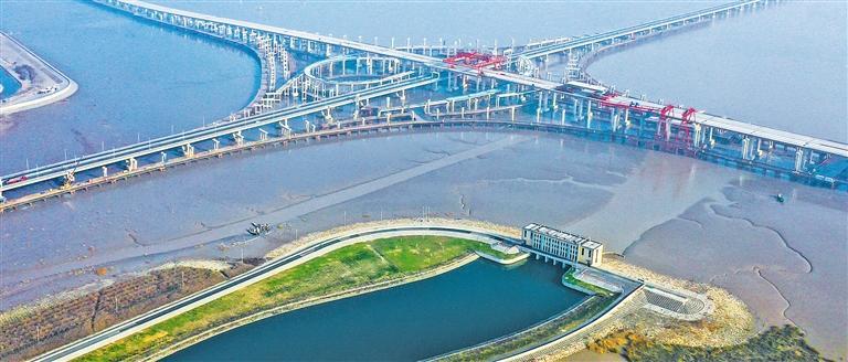 1月7日,建设中的浙江省宁波市镇海区后海塘明海闸站工程项目工地。当地利用冬季枯水期和农闲时节,组织人员和机械设备,对区域内的海塘堤坝和沟渠进行加固改造、清淤疏浚,提升防洪、挡潮、排涝能力。胡学军摄(中经视觉)