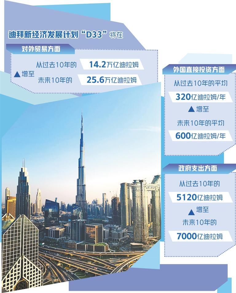 在最新发布的“D33”计划首批项目中,包括启动迪拜绿色和可持续制造计划,大力发展清洁能源领域的制造业;启动“迪拜2033未来经济走廊计划”,加大与非洲、拉丁美洲及东南亚的经贸往来;启动“迪拜贸易商项目”,为重点行业的新一代贸易商充分赋能;推出迪拜统一许可证,作为所有在迪拜营商企业的唯一商业标识;启动“迪拜沙箱”,对新技术及其商业化模式进行测试,将迪拜打造成为全球创新中心;制定中小企业规模扩大计划,确定400家具有潜力的企业,支持其能力建设及全球增长。