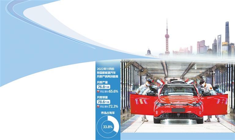 我国新能源汽车产业动能强劲,2022年更是跑出了加速度。中国汽车工业协会发布的数据显示,2022年11月份,我国新能源汽车月度产销再创新高,分别达到76.8万辆和78.6万辆,同比分别增长65.6%和72.3%,市场占有率达到33.8%。2022年前11个月,新能源汽车产销分别完成625.3万辆和606.7万辆,同比均增长1倍,市场占有率达到25%。