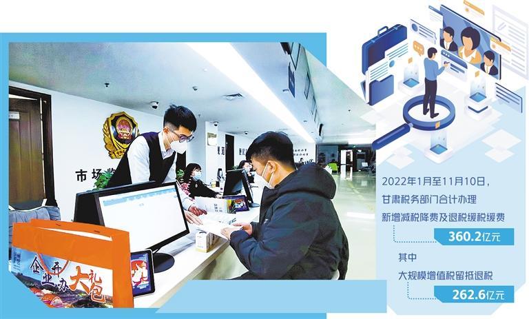 据了解,2022年1月至11月10日,甘肃税务部门合计办理新增减税降费及退税缓税缓费360.2亿元。其中,大规模增值税留抵退税262.6亿元,超上年全年退税规模7倍。