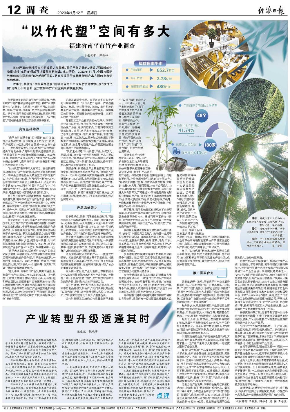 “南平市竹资源丰富,竹林面积652.7万亩,竹产业基础较好,全市规模以上竹企业180家,年产值约314亿元,拥有全国第一家上市竹企业——龙竹科技等龙头企业,为推行‘以竹代塑’提供了有利条件。”南平市副市长杨新强表示,“当前南平竹产业发展氛围越来越浓。2022年11月,中国竹产业协会发布了‘中国竹产业品牌十强企业榜单’,南平市有龙竹科技集团和祥福工艺两家企业上榜。”