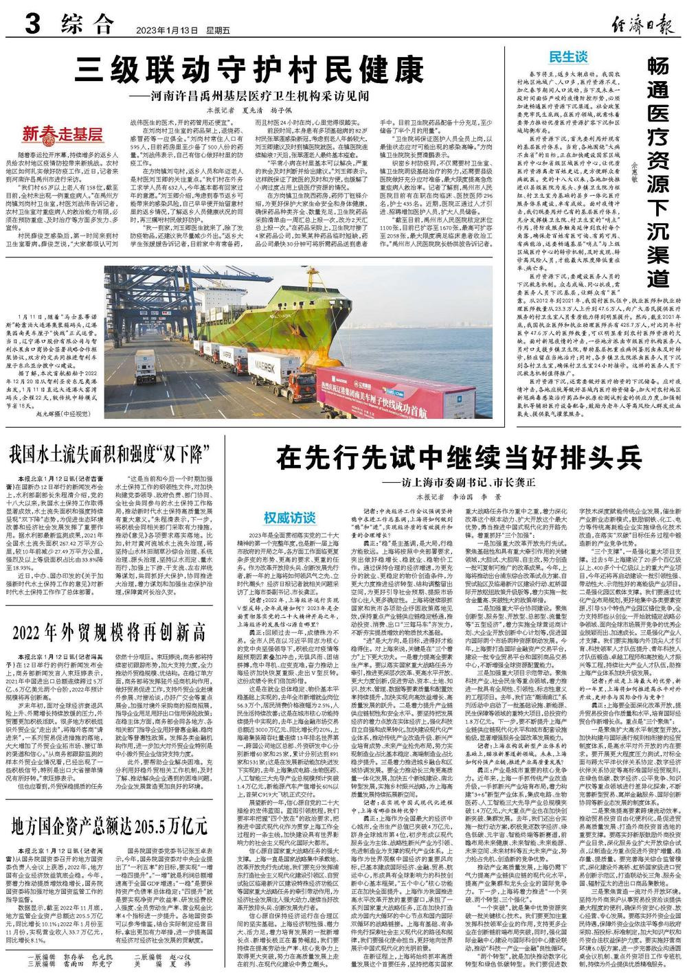 2023年是全面贯彻落实党的二十大精神的第一个完整年度,也是新一届上海市政府的开局之年,各方面工作面临更复杂多变的形势、更高的要求、更重的任务。作为改革开放排头兵、创新发展先行者,新一年的上海将如何领风气之先、立时代潮头?经济日报记者就相关问题采访了上海市委副书记、市长龚正。