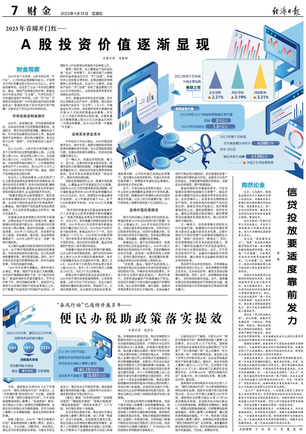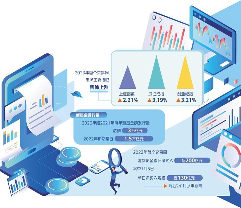 2023年首个交易周,A股市场实现“开门红”,三大股指全周涨幅均逾2%,沪深两市日均交易量也放大至8000亿元以上。受市场回暖带动,在经历了过去一年的低位震荡后,基金、理财产品净值出现反弹,新基金发行市场也再现“日光基”,外资则加快了对我国权益资产的布局。A股“开门红”行情是否有望延续?今年我国权益市场存在哪些机会?普通投资者又该如何进行资产配置?记者采访了多位业内专家和机构。