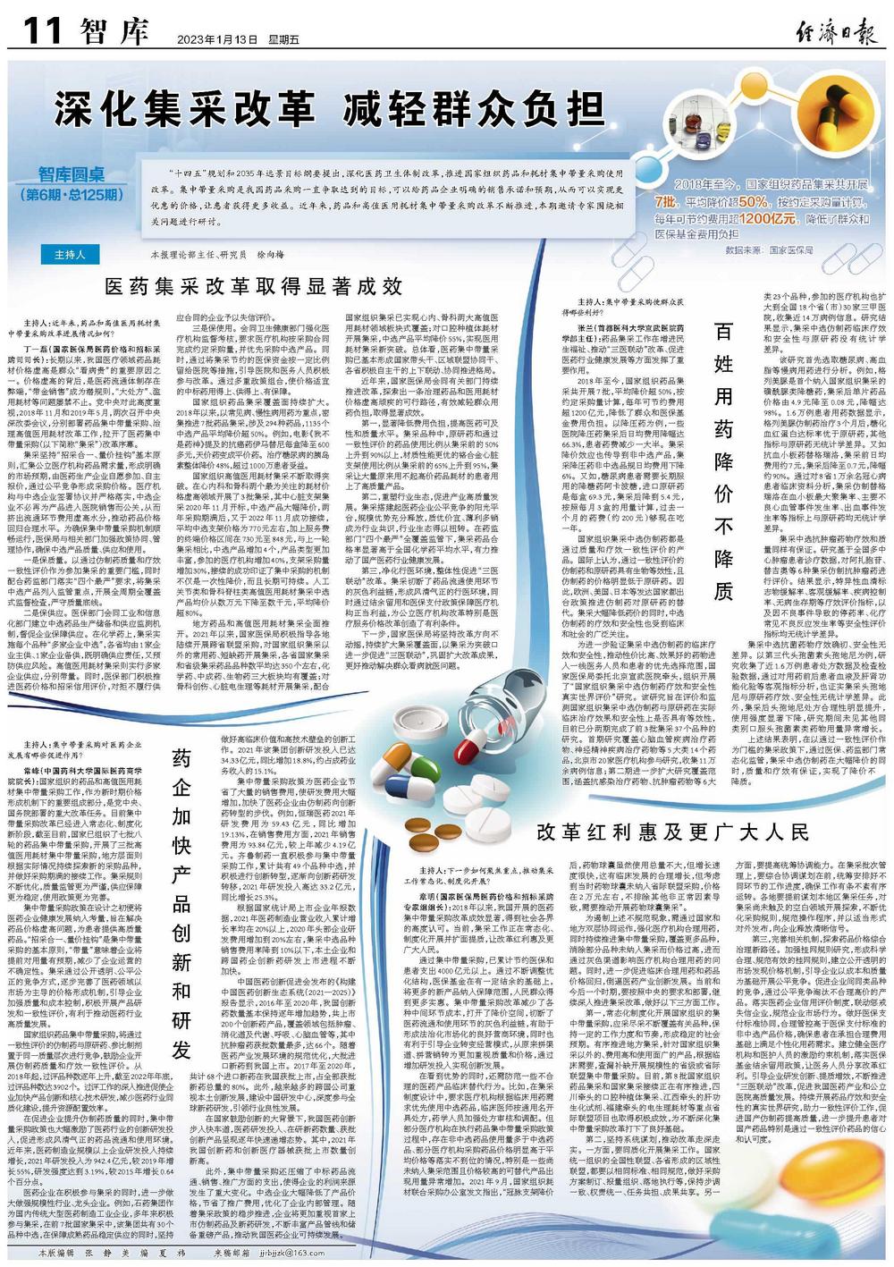 章明(国家医保局医药价格和招标采购专家组组长):2018年以来,我国开展的医药集中带量采购改革成效显著,得到社会各界的高度认可。当前,集采工作正在常态化、制度化开展并扩面提质,让改革红利惠及更广大人民。