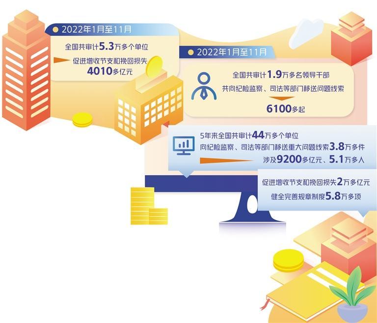 此外,审计发挥反腐败“利剑”作用,加强权力制约和反腐倡廉,严肃查处重大问题线索。2022年1月至11月,全国共审计1.9万多名领导干部,共向纪检监察、司法等部门移送问题线索6100多起。