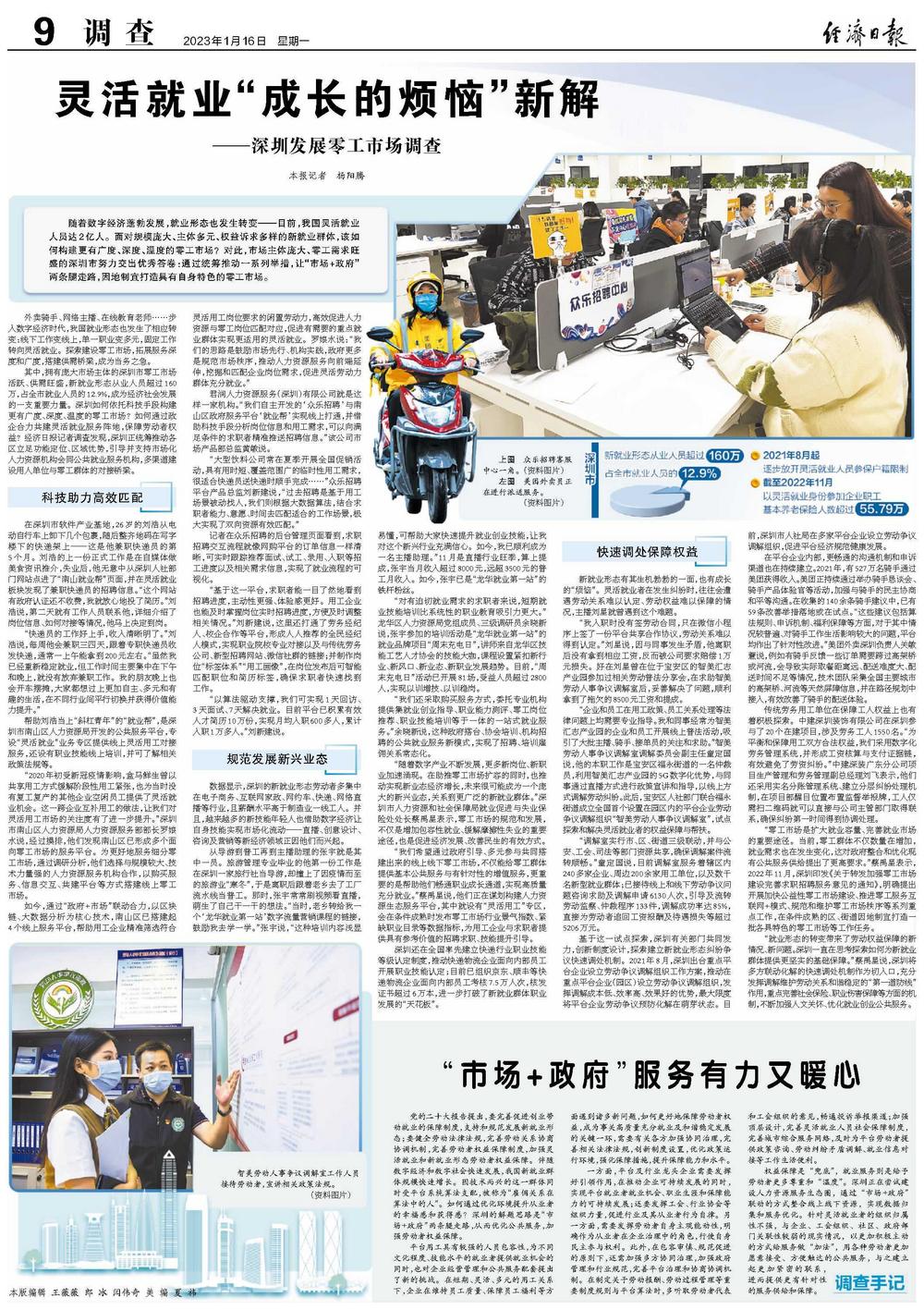 其中,拥有庞大市场主体的深圳市零工市场活跃、供需旺盛,新就业形态从业人员超过160万,占全市就业人员的12.9%,成为经济社会发展的一支重要力量。深圳如何依托科技手段构建更有广度、深度、温度的零工市场?如何通过政企合力共建灵活就业服务阵地,保障劳动者权益?经济日报记者调查发现,深圳正统筹推动各区立足功能定位、区域优势,引导并支持市场化人力资源机构会同公共就业服务机构,多渠道建设用人单位与零工群体的对接桥梁。