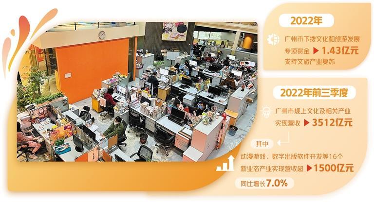 数据显示:2022年前三季度,广州市规上文化及相关产业实现营收3512亿元,其中动漫游戏、数字出版软件开发等16个新业态产业实现营收超1500亿元,同比增长7.0%。